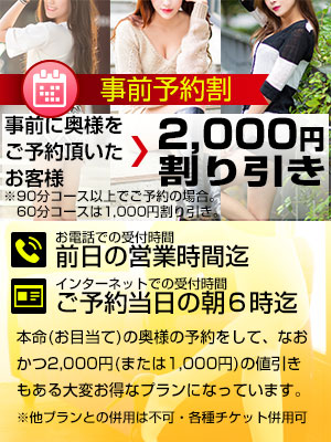 事前に奥様をご予約して頂いたお客様に¥2,000−の値引をさせて頂きます。